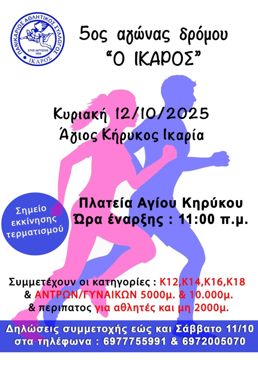 Την Κυριακή 12 Οκτωβρίου στις 11 το πρωί, με σημείο εκκίνησης και τερματισμού την πλατεία Αγίου Κηρύκου, θα διεξαχθεί ο 5ος αγώνας δρόμου «Ο Ίκαρος», που διοργανώνει ο Πανικάριος Αθλητικός Σύλλογος «Ίκαρος». Ο αγώνας πραγματοποιείται με τη στήριξη του Δήμου Ικαρίας, του ΕΚΑΒ, του Αστυνομικού Τμήματος Αγίου Κηρύκου και πλήθους εθελοντών.