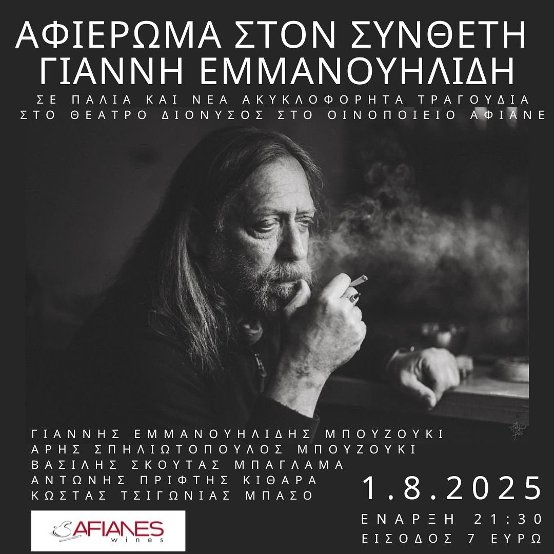 Την Παρασκευή 1η Αυγούστου το Οινοποιείο Αφιανέ φιλοξενεί μια ξεχωριστή εκδήλωση, αφιερωμένη στον Ικαριώτη συνθέτη Γιάννη Εμμανουηλίδη. Σε μια ατμόσφαιρα γεμάτη μνήμη, συναίσθημα και δημιουργικότητα, ο συνθέτης παρουσιάζει παλιά και νέα ακυκλοφόρητα τραγούδια του, πλαισιωμένος από αγαπημένους του συνεργάτες και φίλους μουσικούς.