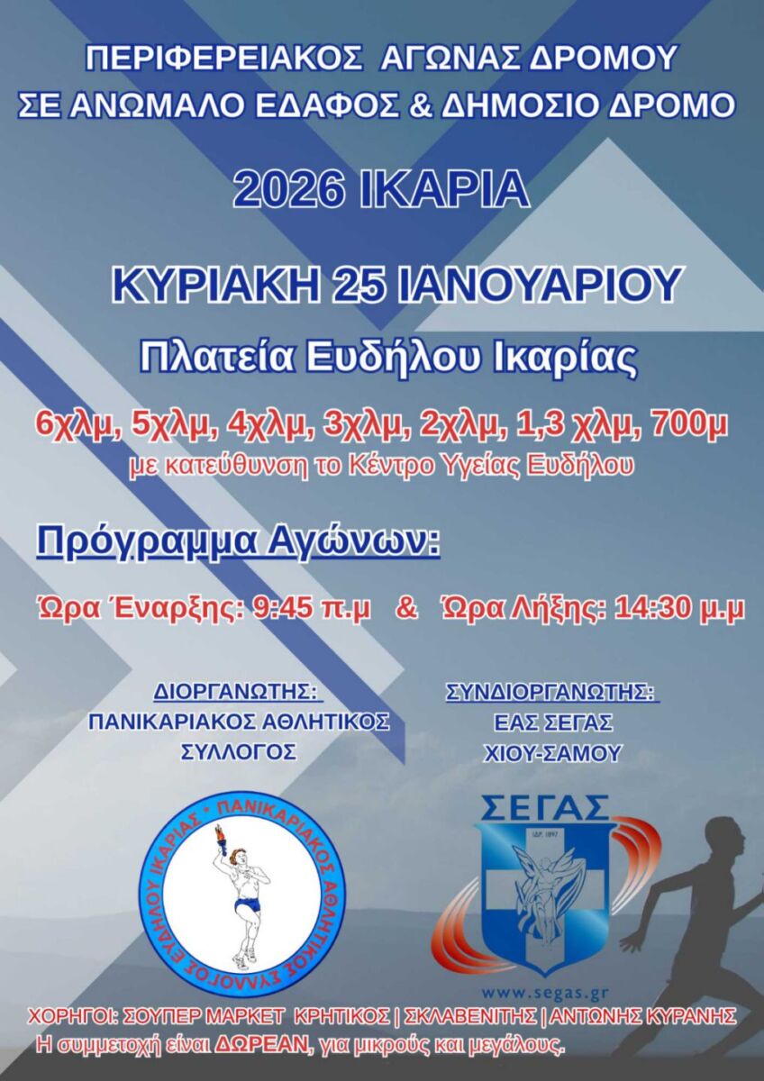 Αγώνας δρόμου σε ανώμαλο έδαφος και δημόσιο δρόμο θα διεξαχθεί την Κυριακή 25 Ιανουαρίου 2026 με εκκινήσεις από την πλατεία Ευδήλου και κατεύθυνση προς το Κέντρο Υγείας. Σύμφωνα με το πρόγραμμα, η διοργάνωση ξεκινά στις 9:45 και ολοκληρώνεται στις 14:30, με διαδρομές 6, 5, 4, 3, 2 και 1,3 χιλιομέτρων, καθώς και 700 μέτρων.