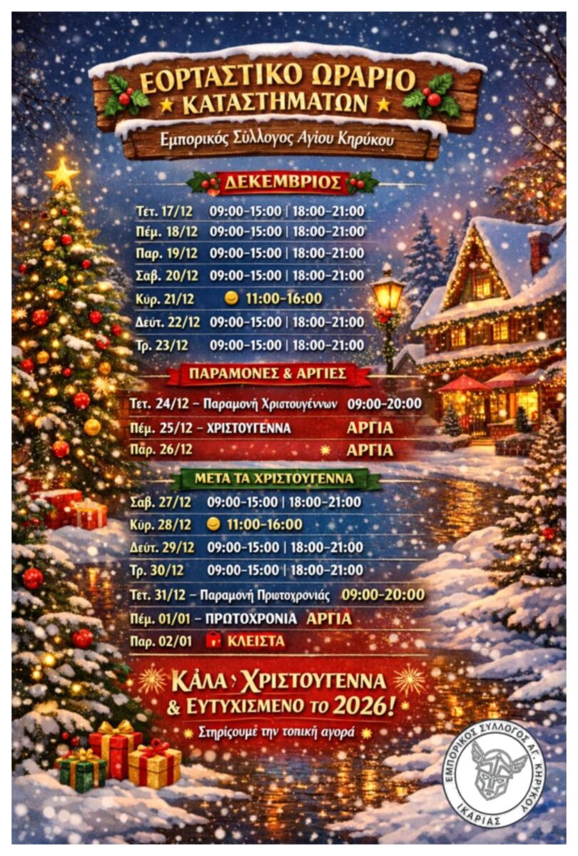 Ο Εμπορικός Σύλλογος Αγίου Κηρύκου γνωστοποίησε το εορταστικό ωράριο λειτουργίας των εμπορικών καταστημάτων για την περίοδο των Χριστουγέννων και της Πρωτοχρονιάς.