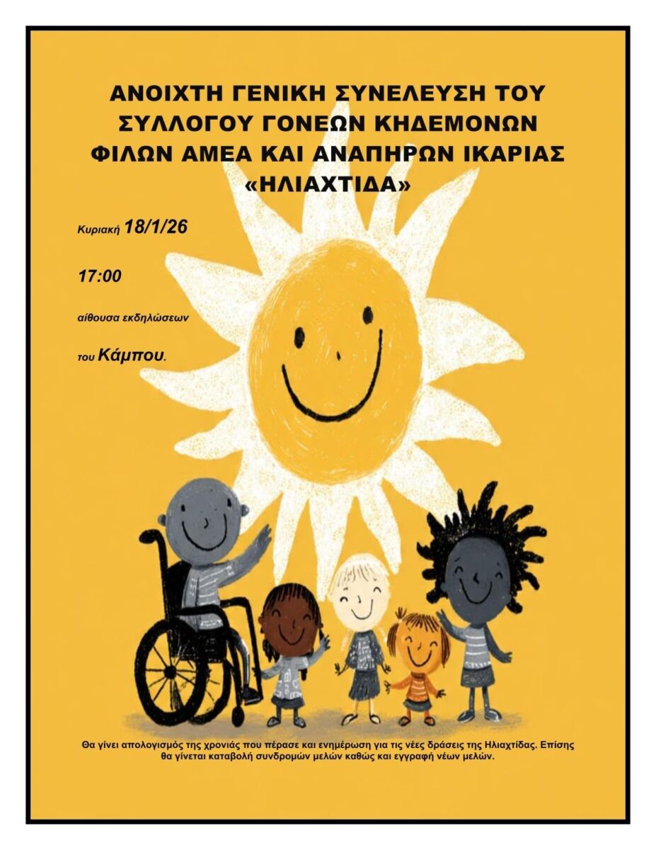 Ο Σύλλογος Γονέων, Κηδεμόνων και Φίλων ΑΜΕΑ και Αναπήρων Ικαρίας «Ηλιαχτίδα» ανακοίνωσε ανοιχτή γενική συνέλευση την Κυριακή 18 Ιανουαρίου 2026 στις 17.00. Η συνέλευση θα πραγματοποιηθεί στην αίθουσα εκδηλώσεων του Κάμπου. Σύμφωνα με την ανακοίνωση, θα γίνει απολογισμός της χρονιάς που πέρασε και ενημέρωση για τις νέες δράσεις του συλλόγου. Θα πραγματοποιηθεί επίσης καταβολή συνδρομών μελών και εγγραφή νέων μελών.