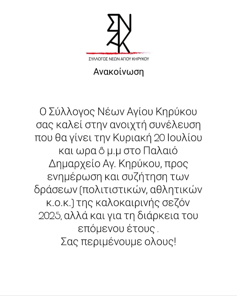 Ο Σύλλογος Νέων Αγίου Κηρύκου προσκαλεί τα μέλη και τους φίλους του σε ανοικτή συνέλευση την Κυριακή 20 Ιουλίου, στις 20:00, στο Παλαιό Δημαρχείο Αγίου Κηρύκου.
