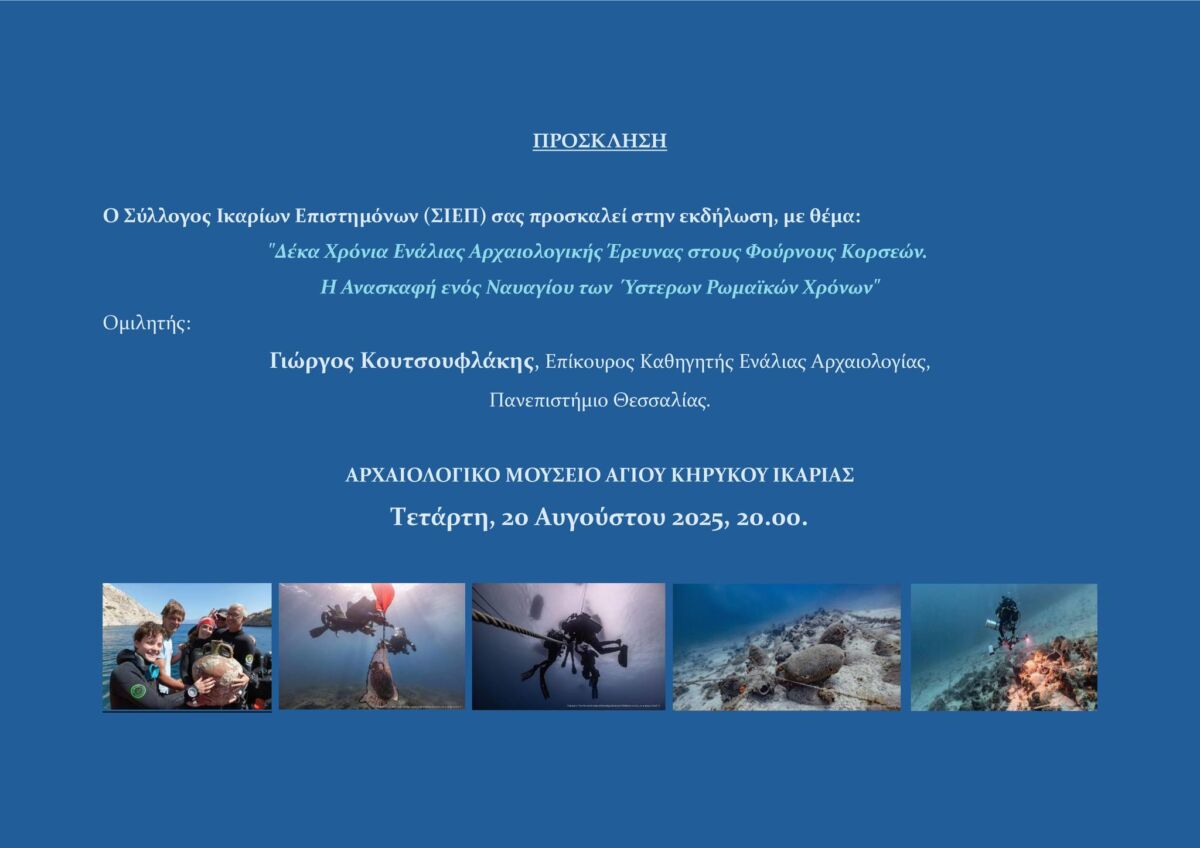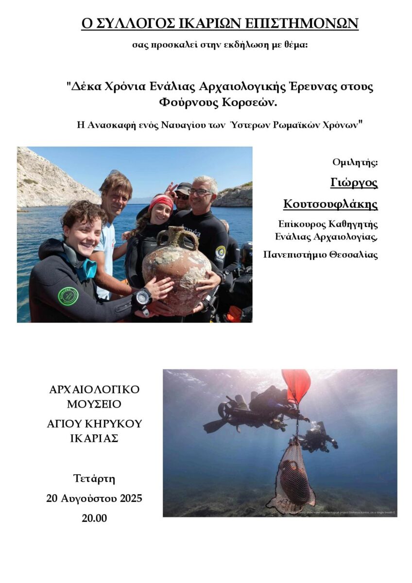 Μια μοναδική ευκαιρία να ταξιδέψουν στον χρόνο, στα μυστικά των βυθών και στην πλούσια ναυτική ιστορία του Αιγαίου, θα έχουν όσοι βρεθούν την Τετάρτη 20 Αυγούστου, στις 20:00, στο Αρχαιολογικό Μουσείο Αγίου Κηρύκου, όπου ο Σύλλογος Ικαρίων Επιστημόνων (Σ.Ι.ΕΠ.) διοργανώνει εκδήλωση με θέμα «Δέκα Χρόνια Ενάλιας Αρχαιολογικής Έρευνας στους Φούρνους Κορσεών – Η Ανασκαφή ενός Ναυαγίου των Ύστερων Ρωμαϊκών Χρόνων».