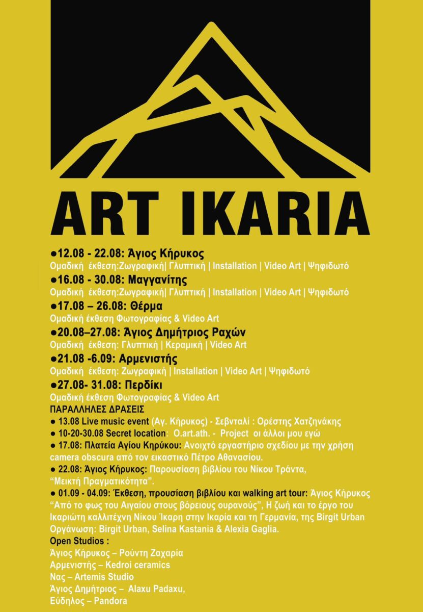 01.09 – 04.09: Έκθεση, παρουσίαση βιβλίου και walking art tour: Άγιος Κήρυκος «Από το φως του Αιγαίου στους βόρειους ουρανούς». Η ζωή και το έργο του Ικαριώτη καλλιτέχνη Νίκου Ίκαρη στην Ικαρία και τη Γερμανία, της Birgit Urban Οργάνωση: Birgit Urban, Selina Kastania & Alexia Gaglia.