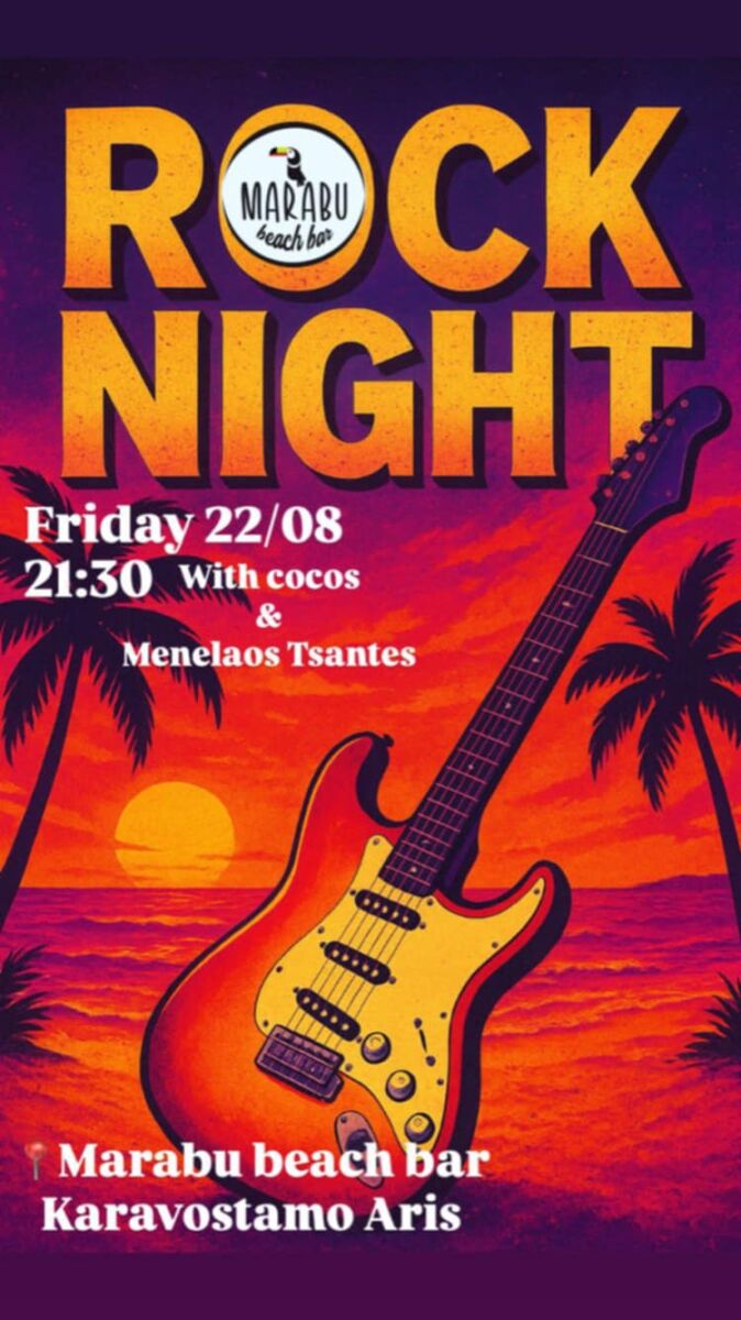 Την Παρασκευή 22 Αυγούστου, στις 21:30, το Marabu Beach Bar στον Άρη Ποταμό στο Καραβόσταμο βάζει φωτιά στη νύχτα με μια καθαρή δόση rock δίπλα στη θάλασσα! Οι Νίκος Κούβαρης και Μενέλαος Τσαντές ανεβαίνουν στη σκηνή για μια live βραδιά γεμάτη ενέργεια.