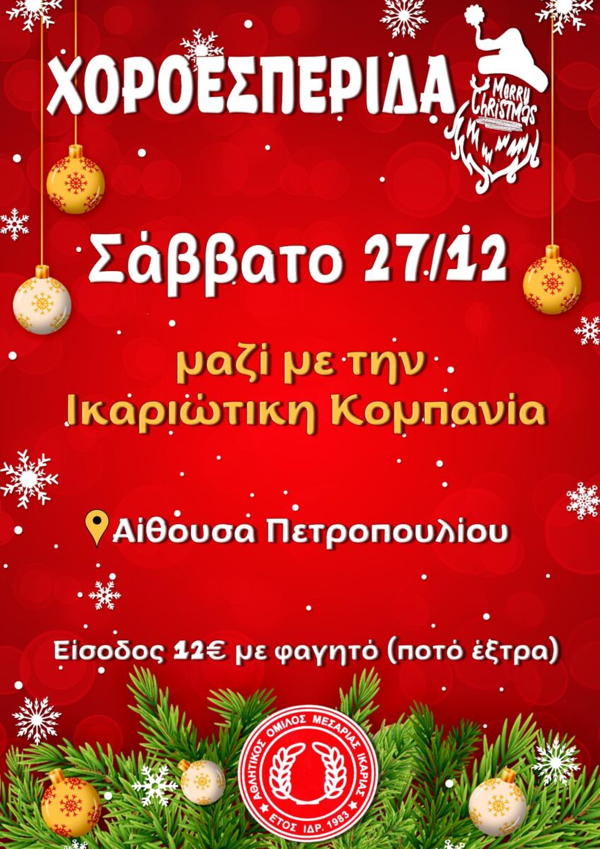 Το Σάββατο 27 Δεκεμβρίου από τις 9 το βράδυ, ο Αθλητικός Όμιλος Μεσαριάς διοργανώνει την χοροεσπερίδα του στην αίθουσα Πετροπουλιού, όπως κάθε χρόνο έτσι και φέτος, με ντόπιο κρασί, πλούσιο μενού και με τη μουσική συνοδεία της Ικαριώτικης Κομπανίας (Σακούτης, Ευστρατουδάκης, Παπαλάς, Μελάς).
