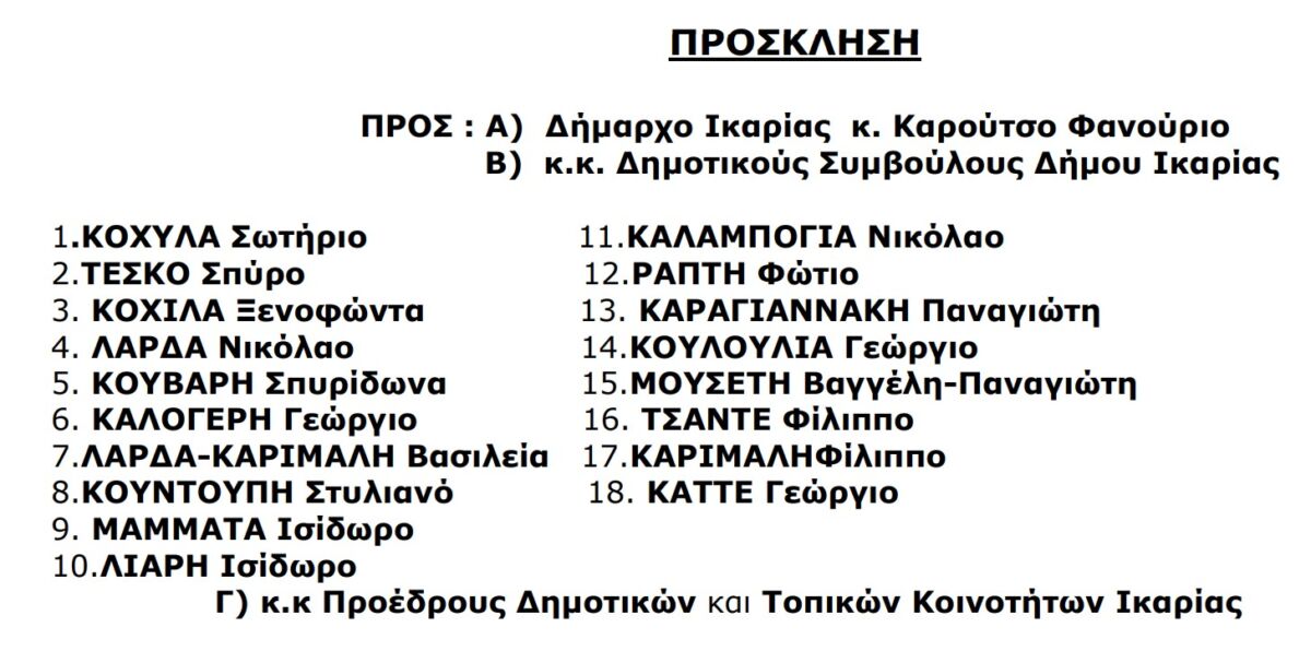 Στις συνεδριάσεις έχουν προσκληθεί ο Δήμαρχος Ικαρίας, κ. Φανούριος Καρούτσος, το σύνολο των μελών του Δημοτικού Συμβουλίου, καθώς και οι Πρόεδροι των Δημοτικών και Τοπικών Κοινοτήτων του νησιού.