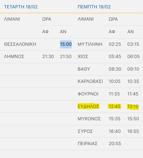 Για την Πέμπτη 19 Φεβρουαρίου, η εταιρεία ανέφερε ότι το πλοίο αναμένεται να προσεγγίσει τους Φούρνους στις 11:35 με αναχώρηση στις 11:45, ενώ στον Εύδηλο η άφιξη προγραμματίζεται για τις 12:45 (αντί των 09:45) και η αναχώρηση για τις 13:15 (αντί των 10:15). Στη συνέχεια, το δρομολόγιο θα συνεχιστεί προς τα λιμάνια της Μυκόνου και της Σύρου, με τον τελικό κατάπλου στο λιμάνι του Πειραιά να υπολογίζεται πλέον για τις 20:55, αντί της αρχικά ανακοινωθείσας ώρας στις 17:55.