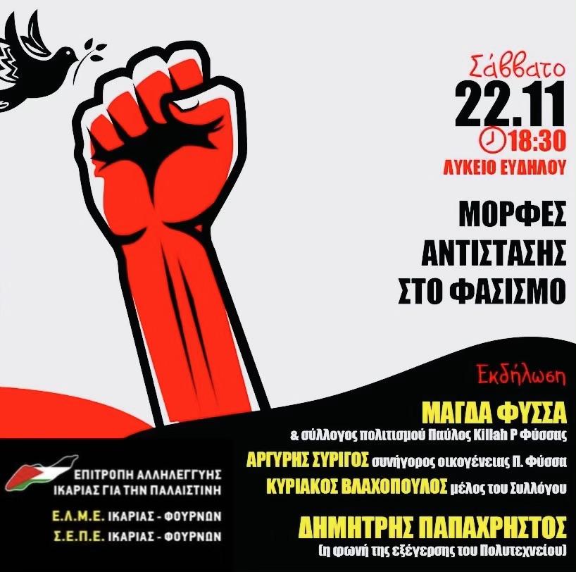 Το Σάββατο 22 Νοεμβρίου, στις 18:30, θα πραγματοποιηθεί στο Λύκειο Ευδήλου η εκδήλωση «Μορφές Αντίστασης στον Φασισμό», με τη συμμετοχή της Μάγδας Φύσσα και του Συλλόγου Πολιτισμού Παύλος Killah P Φύσσας. Θα μιλήσουν ο Αργύρης Συρίγος, συνήγορος της οικογένειας Φύσσα, ο Κυριάκος Βλαχόπουλος, μέλος του συλλόγου, και ο Δημήτρης Παπαχρήστος, η φωνή του ραδιοφωνικού σταθμού της εξέγερσης του Πολυτεχνείου. Την εκδήλωση διοργανώνουν η Επιτροπή Αλληλεγγύης Ικαρίας για την Παλαιστίνη, η Ένωση Λειτουργών Μέσης Εκπαίδευσης Ικαρίας και Φούρνων και ο Σύλλογος Εκπαιδευτικών Πρωτοβάθμιας Εκπαίδευσης Ικαρίας και Φούρνων. Η Επιτροπή Αλληλεγγύης Ικαρίας για την Παλαιστίνη ευχαρίστησε τη Λαϊκή Ορχήστρα Ικαρίας για την οικονομική στήριξη της διοργάνωσης.