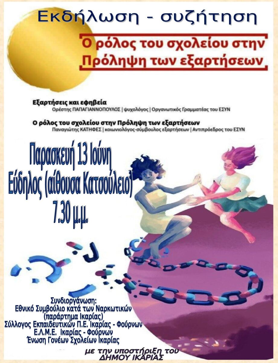 Το Εθνικό Συμβούλιο κατά των Ναρκωτικών (παράρτημα Ικαρίας), σε συνδιοργάνωση με τον Σύλλογο Εκπαιδευτικών Π.Ε. Ικαρίας-Φούρνων, την Ε.Λ.Μ.Ε. Ικαρίας-Φούρνων, την Ένωση Γονέων Σχολείων Ικαρίας και με την υποστήριξη του Δήμου Ικαρίας σας καλούν σε εκδήλωση-συζήτηση την Παρασκευή 13 Ιούνη 2025, ώρα 7.30 μ.μ. στον Εύδηλο (αίθουσα