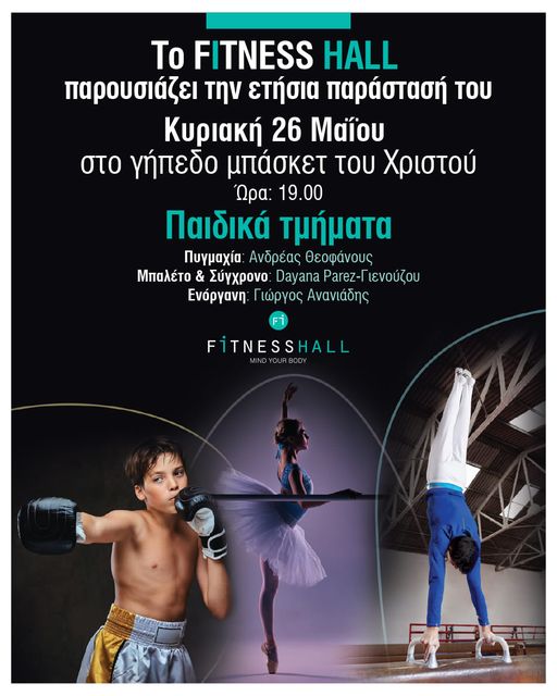 Το Fitness Hall Ikaria, με την ευκαιρία της ολοκλήρωσης των μαθημάτων, την Κυριακή 26 Μαΐου θα πραγματοποιήσει την ετήσια παράστασή του στο γήπεδο μπάσκετ του Χριστού Ραχών, με ώρα έναρξης τις 7.00 το απόγευμα.
