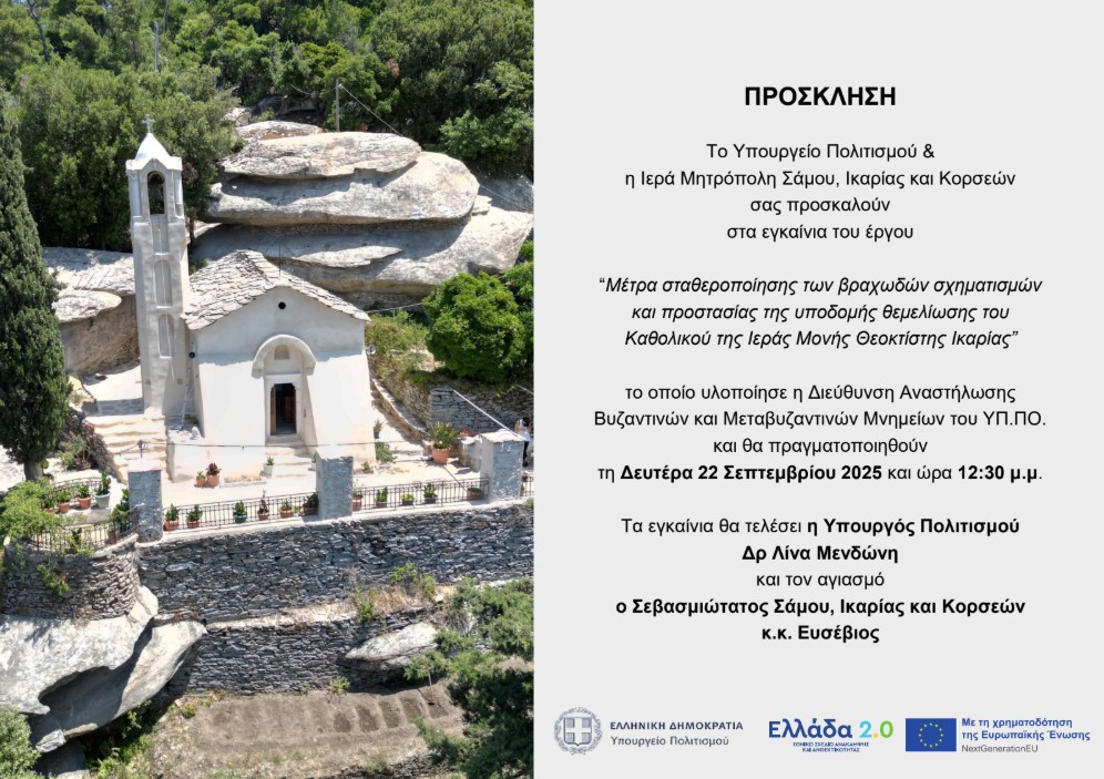 12:30 Εγκαίνια έργου / μέτρα σταθεροποίησης των βραχωδών σχηματισμών και προστασίας της υποδομής θεμελίωσης της Ι.Μ Θεοκτίστης Ικαρίας.