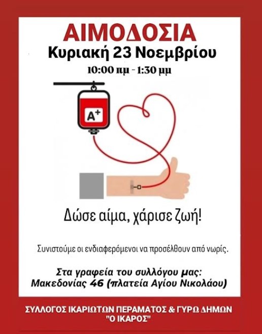 Ο Σύλλογος Ικαριωτών Περάματος και Γύρω Δήμων «Ο Ίκαρος» διοργανώνει εθελοντική αιμοδοσία την Κυριακή 23 Νοεμβρίου, από τις 10.00 π.μ. έως τις 1.30 μ.μ., στα γραφεία του, επί της οδού Μακεδονίας 46, στην πλατεία Αγίου Νικολάου στο Πέραμα.