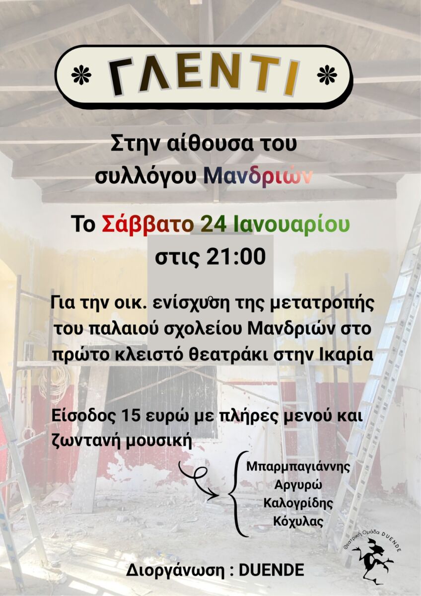 Γλέντι ενίσχυσης διοργανώνει η Θεατρική Ομάδα DUENDE Ικαρίας το Σάββατο 24 Ιανουαρίου στις 21:00, στην αίθουσα του Συλλόγου Μανδριών. Η είσοδος είναι 15 ευρώ με πλήρες μενού και ζωντανή μουσική, για την οικονομική στήριξη της μετατροπής του παλαιού σχολείου Μανδριών στο πρώτο κλειστό θεατράκι του νησιού.