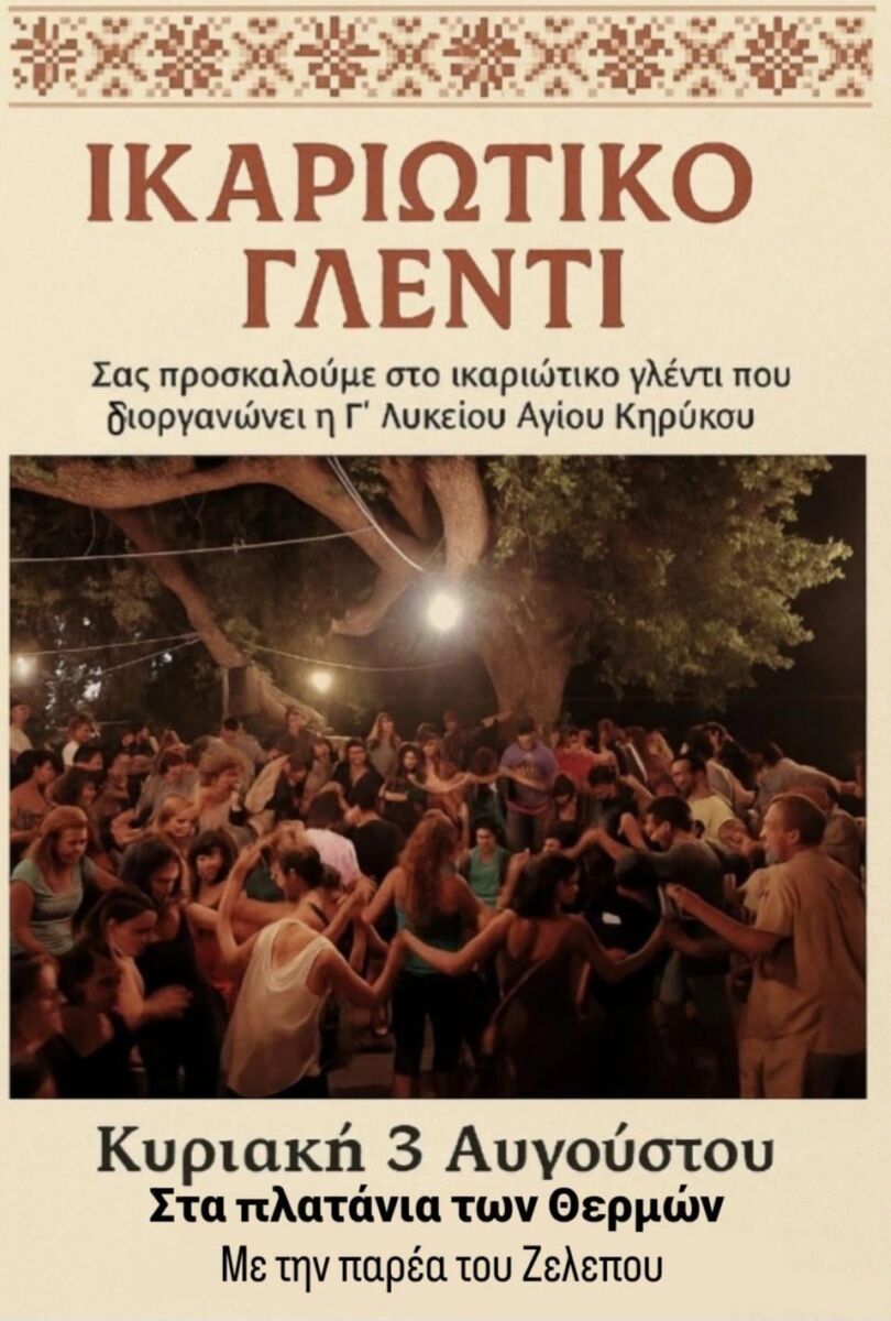 Η Γ’ Λυκείου Αγίου Κηρύκου διοργανώνει την Κυριακή 3 Αυγούστου ένα αυθεντικό ικαριώτικο γλέντι στο ρέμα των Θέρμων, κάτω από τα πλατάνια, με τη συνοδεία του Βαγγέλη Ζελεπού και της παρέας του.