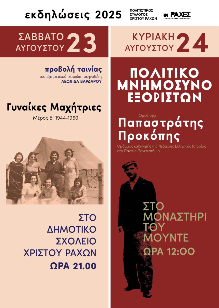 Ο Πολιτιστικός Σύλλογος Χριστού Ραχών και ο Σύλλογος Ραχιωτών Ικαρίας «Οι Ράχες» ενώνουν τις δυνάμεις τους και διοργανώνουν και φέτος, στο πλαίσιο των καθιερωμένων εκδηλώσεων μνήμης και τιμής στους εξόριστους, δύο σημαντικές δράσεις που τιμούν την ιστορία και τη μνήμη του τόπου. Πρόκειται για μια ιδιαίτερη διήμερη αναφορά στην Ιστορία του τόπου μας, με σημείο αναφοράς τους αγώνες και τις θυσίες των αγωνιστών της Αντίστασης και των εξόριστων.