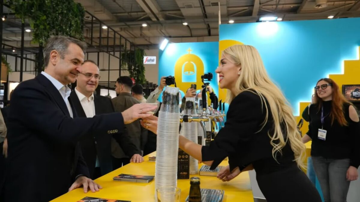 Στιγμιότυπο από την επίσκεψη του Κυριάκου Μητσοτάκη στην έκθεση, όπου το ευχάριστο κλίμα και η ικαριακή ζυθοποιία έκλεψαν τις εντυπώσεις.