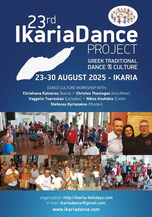 Από τις 23 έως τις 30 Αυγούστου για άλλη μία χρονιά η Ικαρία θα αποτελέσει το επίκεντρο του ελληνικού παραδοσιακού χορού και πολιτισμού, φιλοξενώντας το 23ο IkariaDance Project. Οι δάσκαλοι Χριστιάνα Κατσαρού (Ικαρία), Χρήστος Θεολόγος (Μικρά Ασία), Βαγγέλης Τσαρούχας (Κυκλάδες), Νίκος Κουφάκης (Κρήτη) και Στέφανος Κυριαζάκος (Ρόδος) θα καθοδηγήσουν τους συμμετέχοντες μέσα από εντατικά εργαστήρια χορού, μουσικές βραδιές, εκδρομές σε τοπικά πανηγύρια και βιωματικά εργαστήρια. Το πρόγραμμα περιλαμβάνει καθημερινά μαθήματα χορού, παρουσιάσεις πολιτιστικών θεμάτων, εργαστήριο ελληνικής γλώσσας και συμμετοχή στην αυθεντική εμπειρία της ικαριώτικης φιλοξενίας.