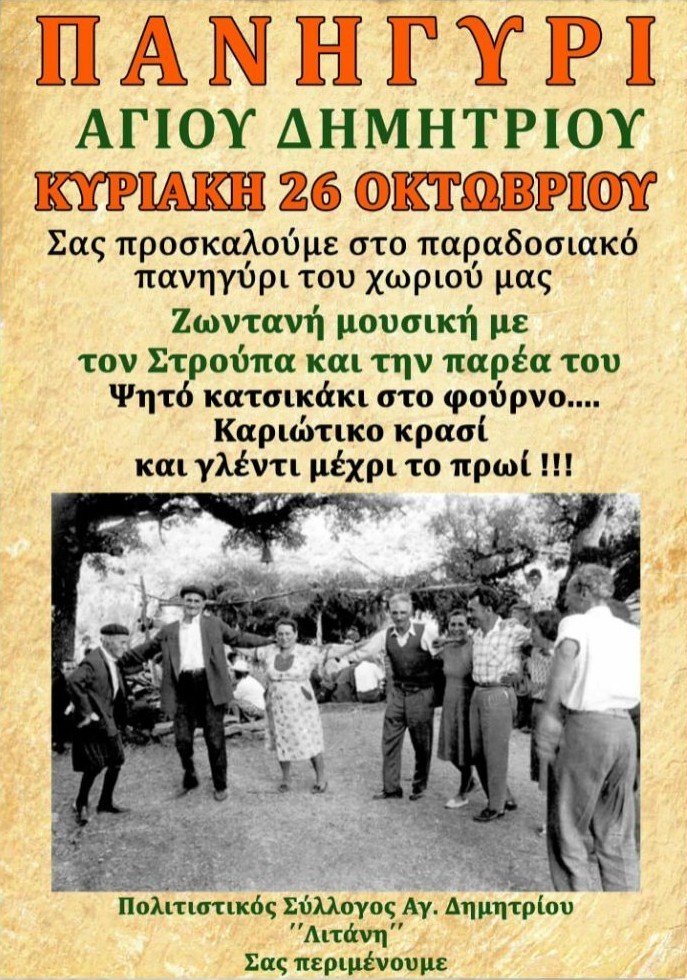 Την Κυριακή 26 Οκτωβρίου, ανήμερα της εορτής του Αγίου Δημητρίου, ο Πολιτιστικός Σύλλογος Αγίου Δημητρίου «Λιτάνη» διοργανώνει παραδοσιακό πανηγύρι στην αίθουσα εκδηλώσεων του χωριού.