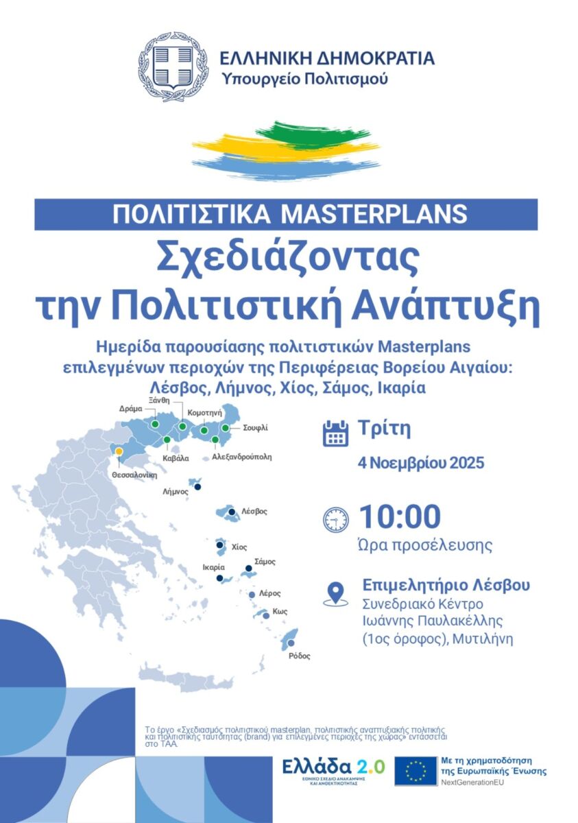 Το Υπουργείο Πολιτισμού διοργανώνει την Τρίτη 4 Νοεμβρίου, στις 10 το πρωί, ημερίδα παρουσίασης των Πολιτιστικών Masterplans για τα νησιά της Περιφέρειας Βορείου Αιγαίου. Η εκδήλωση θα πραγματοποιηθεί στο Συνεδριακό Κέντρο του Επιμελητηρίου Λέσβου με αφορμή τη νέα στρατηγική για τον πολιτισμό και την τοπική ανάπτυξη και θα μεταδοθεί διαδικτυακά. Τα κείμενα των τοπικών masterplans θα δοθούν στη δημοσιότητα πριν από την ημερίδα. Στόχος είναι η ενσωμάτωση του πολιτισμού ως εργαλείου βιώσιμης τοπικής ανάπτυξης και σχεδιασμού περιφερειακής πολιτιστικής πολιτικής μέσα από τα masterplans.