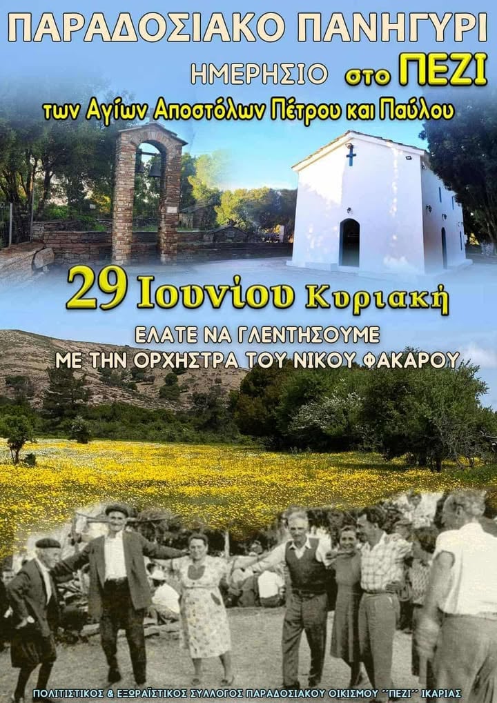 Ο Πολιτιστικός και Εξωραϊστικός Σύλλογος Παραδοσιακού Οικισμού Πέζι Ικαρίας διοργανώνει ένα ξεχωριστό παραδοσιακό πανηγύρι την Κυριακή 29 Ιουνίου, ανήμερα των Αγίων Αποστόλων Πέτρου και Παύλου. Το πανηγύρι θα πραγματοποιηθεί στον όμορφο οικισμό του Πέζι και αναμένεται να προσελκύσει πλήθος κατοίκων και επισκεπτών.