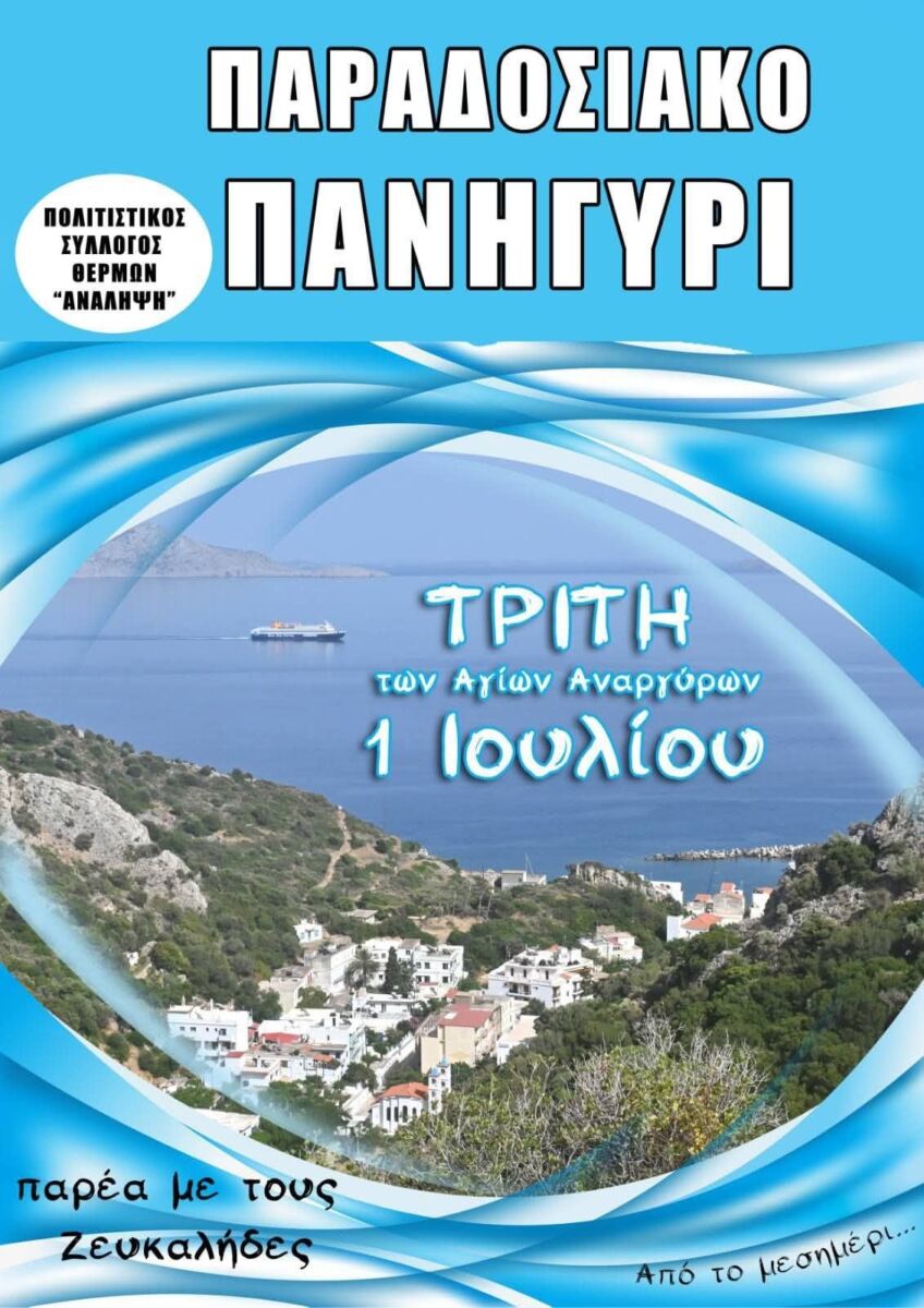 Παραδοσιακό πανηγύρι με ζωντανή μουσική διοργανώνει ο Πολιτιστικός Σύλλογος Θέρμων «Ανάληψη» την Τρίτη 1η Ιουλίου, ανήμερα της εορτής των Αγίων Αναργύρων, από νωρίς το μεσημέρι στη θέση Πλατάνια.