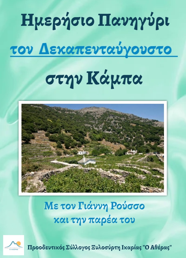 Ο Προοδευτικός Σύλλογος Ξυλοσύρτη Ικαρίας «Ο Αθέρας» διοργανώνει την Παρασκευή 15 Αυγούστου το καθιερωμένο ημερήσιο πανηγύρι στην Κάμπα, έναν από τους πιο γραφικούς προορισμούς του νησιού, κάτω από τη βουνοκορφή του Αθέρα και δίπλα στους διάσημους αμπελώνες της περιοχής.
