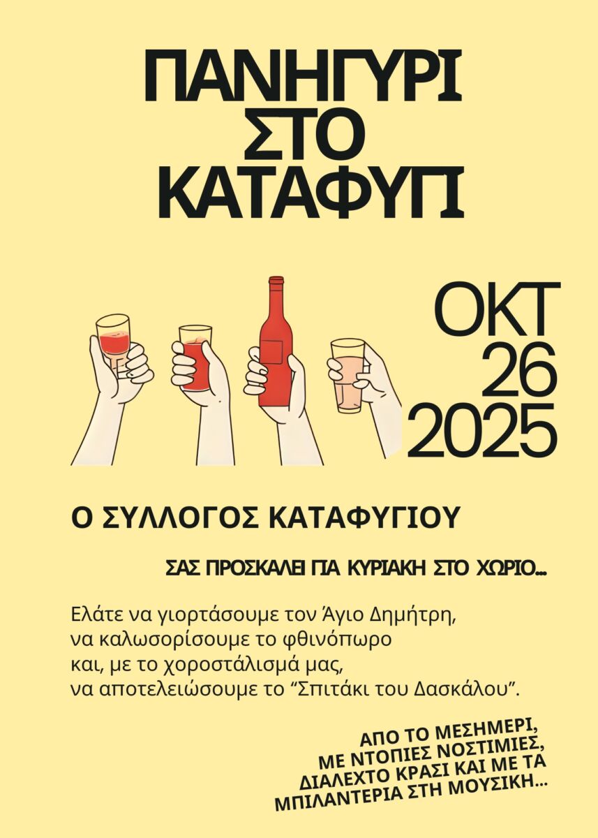 Ο Πολιτιστικός Σύλλογος Καταφυγίου διοργανώνει την Κυριακή 26 Οκτωβρίου το καθιερωμένο πανηγύρι του Αγίου Δημητρίου στο χωριό.