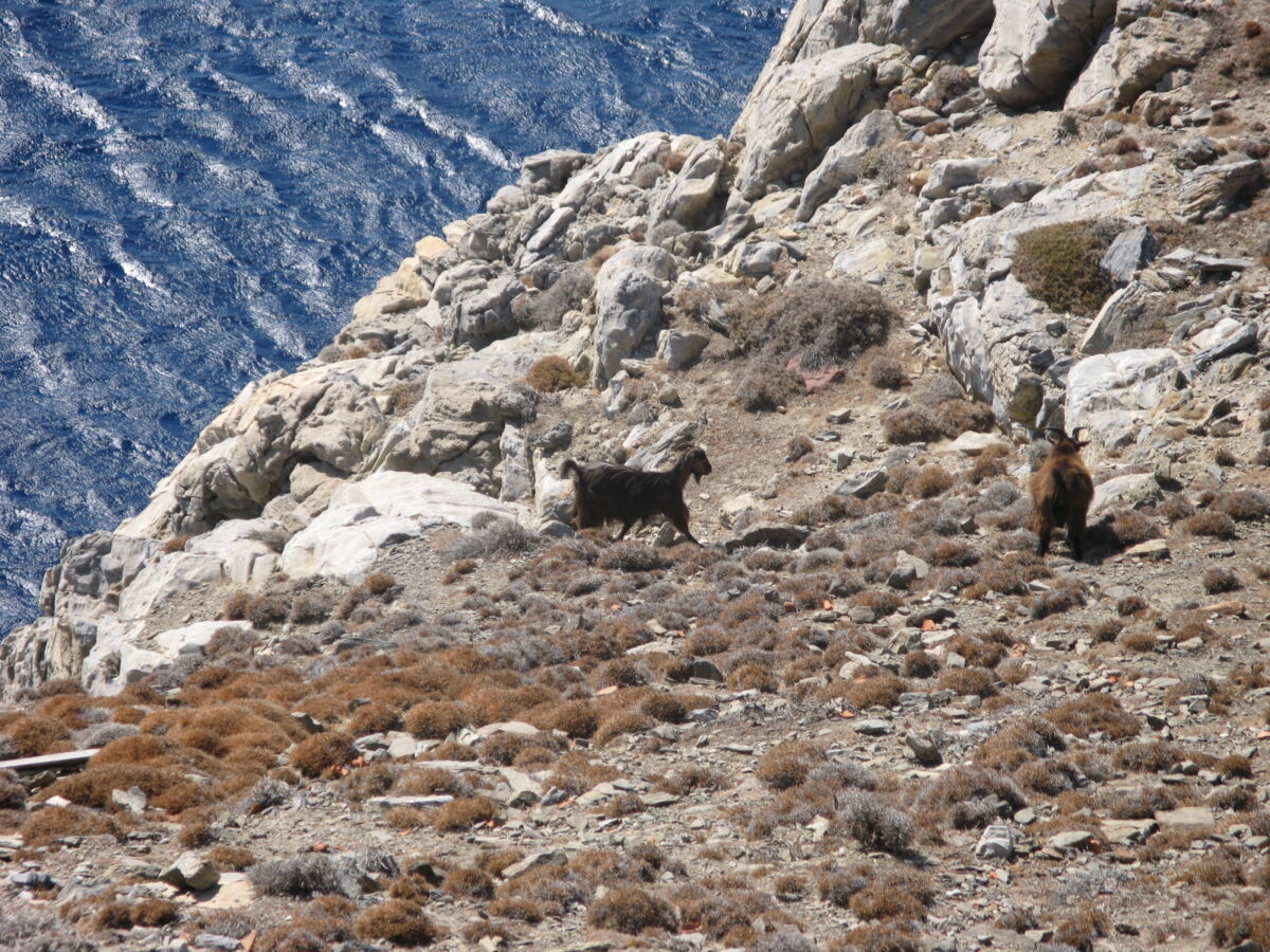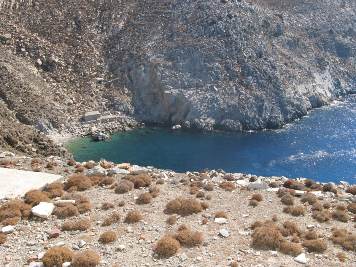 Ανατολικά η θέα προς το εκκλησάκι του Αϊ Γιώργη στην αγκάλη της παραλίας (απ’ όπου ανεβήκαμε) και ακόμα πιο πέρα ο βράχος «καράβι» με φόντο την πίσω όψη του κάβου της Μαύρης. (Η μπροστινή όψη του κάβου της Μαύρης είναι το δυτικότερο σημείο του νησιού το οποίο έχουν θέα οι κάτοικοι του Καρκιναγρίου)