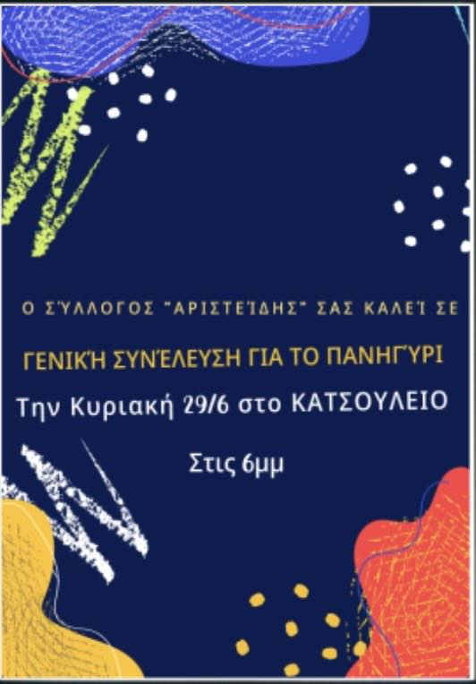 Γενική Συνέλευση του Συλλόγου «Αριστείδης» την Κυριακή 29 Ιουνίου στο Κατσούλειο