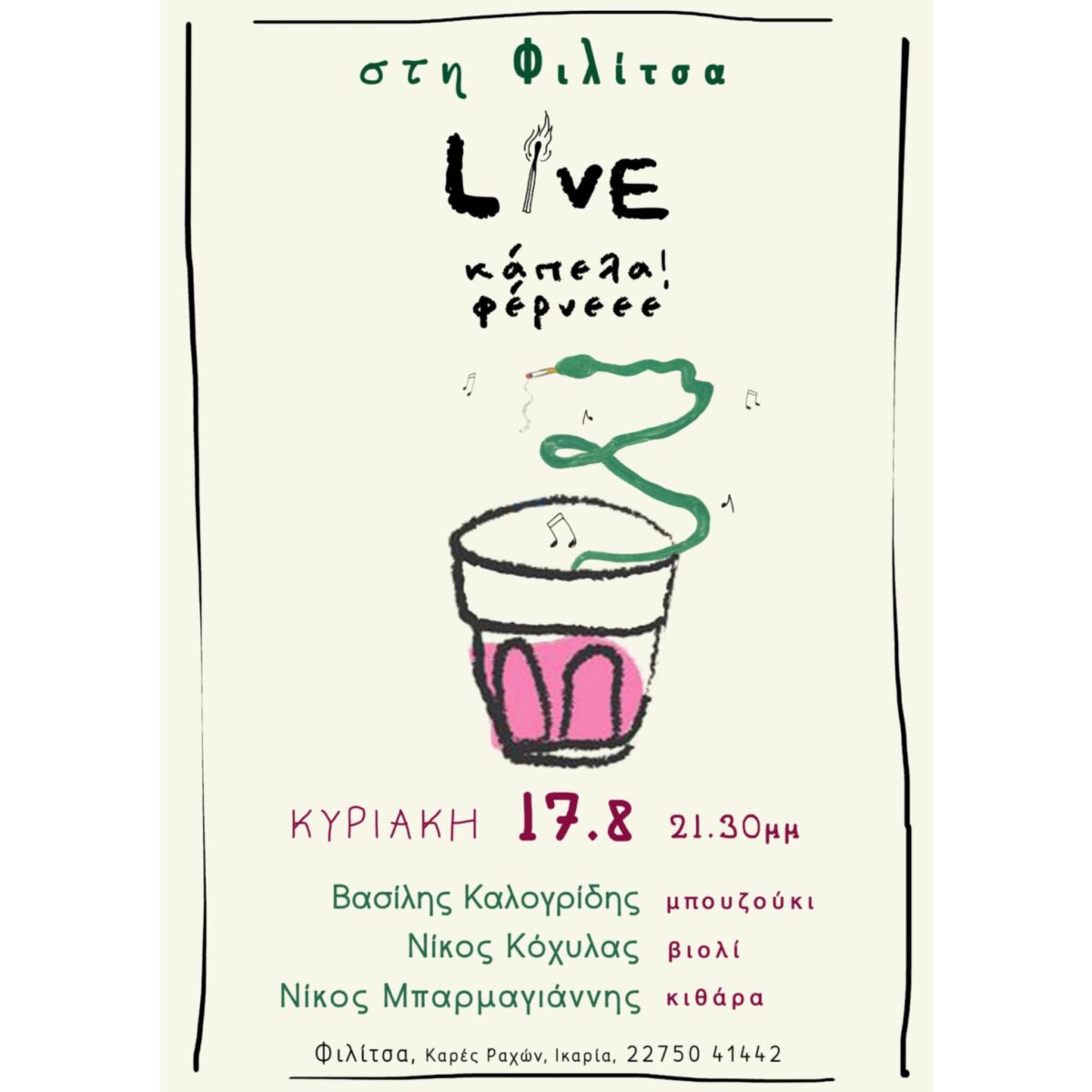 Ο Νίκος Κόχυλας (Ούγκα) στο βιολί, ο Νίκος Μπαρμπαγιάννης στην κιθάρα και ο Βασίλης Καλογρίδης στο μπουζούκι μας προσκαλούν στη φιλόξενη αυλή του εστιατορείου «Φιλίτσα» στις Καρές Ραχών για μια βραδιά ζωντανής μουσικής με αγαπημένες μελωδίες και ρυθμούς που θα σας ταξιδέψουν.
