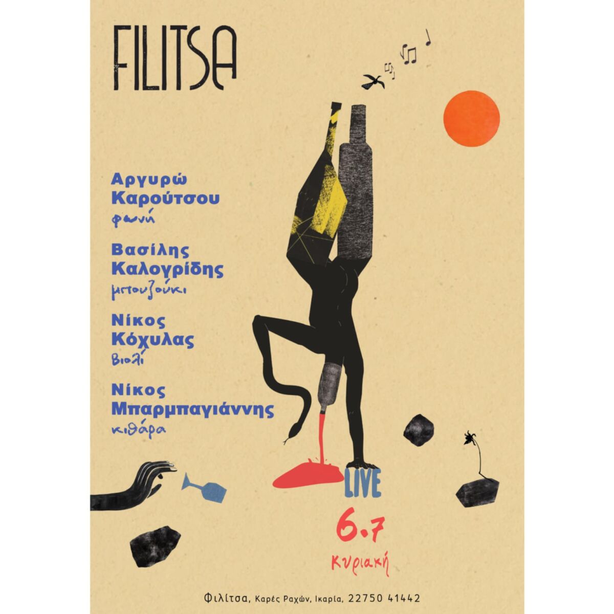Την Κυριακή 6 Ιουλίου, το εστιατόριο Filitsa στις Καρές Ραχών σας προσκαλεί σε μια βραδιά με ζωντανή μουσική, αυθεντικές γεύσεις και καλοκαιρινή ατμόσφαιρα. Στο μουσικό σχήμα συμμετέχουν η Αργυρώ Καρούτσου στο τραγούδι, ο Νίκος Μπαρμπαγιάννης στην κιθάρα, ο Βασίλης Καλογρίδης στο μπουζούκι και ο Νίκος Κόχυλας στο βιολί, σε ένα πρόγραμμα με αγαπημένα διαχρονικά κομμάτια.