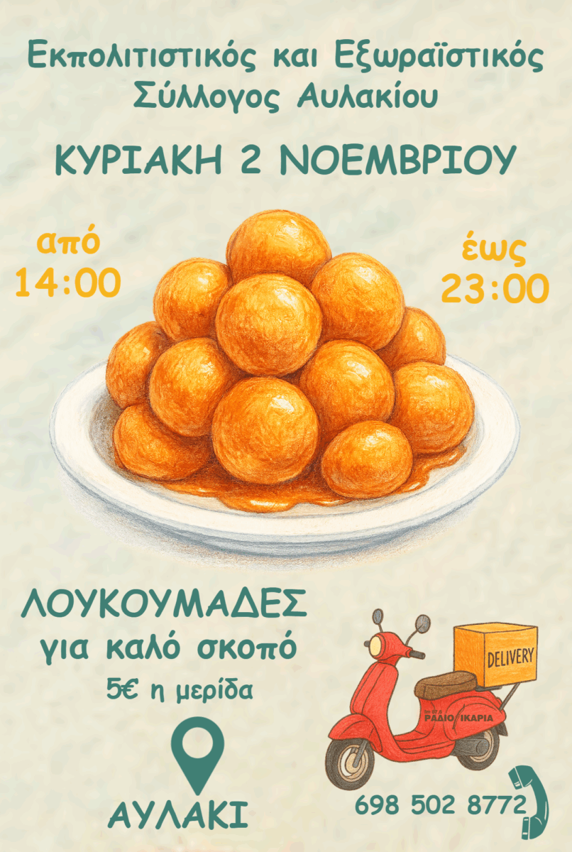 Την Κυριακή 2 Νοεμβρίου, από τις 14:00 έως τις 23:00, στην αίθουσα του Αυλακίου, ο Εκπολιτιστικός και Εξωραϊστικός Σύλλογος Αυλακίου διοργανώνει εκδήλωση αλληλεγγύης με γευστικότατους λουκουμάδες για καλό σκοπό στην αίθουσα του χωριού. Τα έσοδα θα διατεθούν για την κάλυψη ιατρικών αναγκών συντοπίτη.