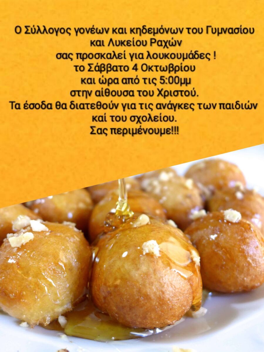 Το Σάββατο 4 Οκτωβρίου, από τις 5 το απόγευμα, ο Σύλλογος Γονέων και Κηδεμόνων του Γυμνασίου και Λυκείου Ραχών σας προσκαλεί στην αίθουσα του Χριστού για λουκουμάδες.