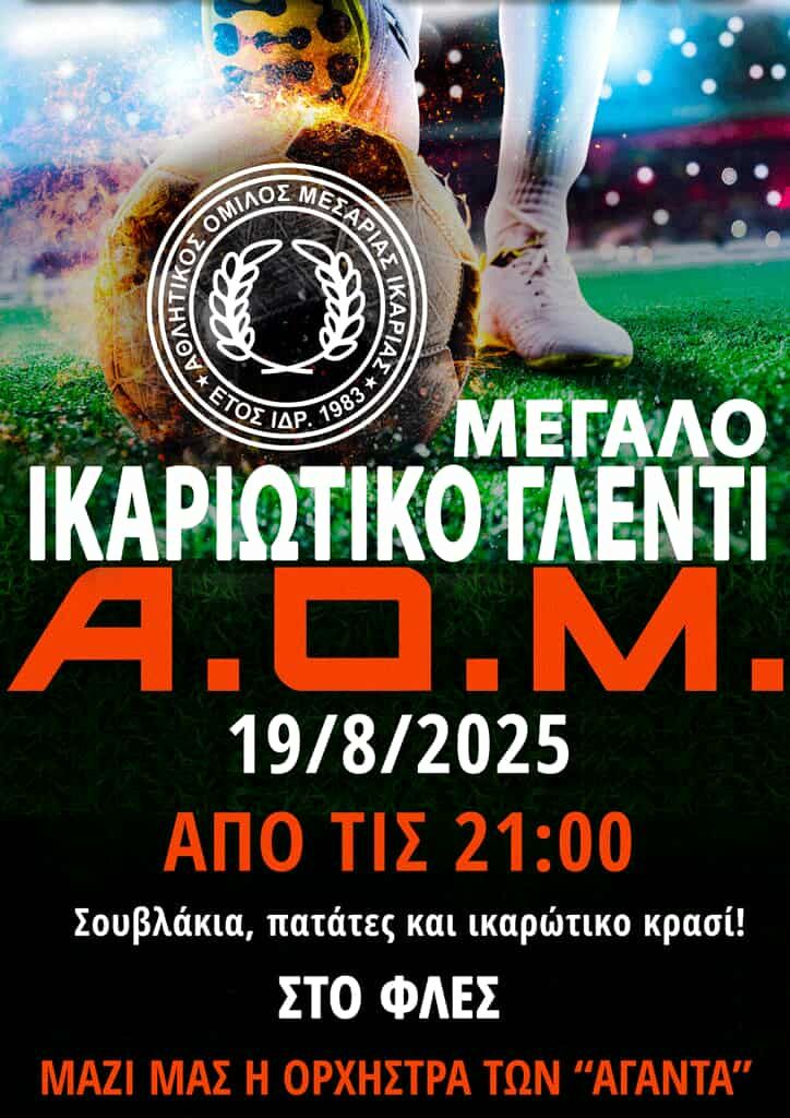 Η Ικαρία ετοιμάζεται για μια ακόμη ανεπανάληπτη βραδιά, καθώς ο Αθλητικός Όμιλος Μεσαριάς διοργανώνει μεγάλο ικαριώτικο γλέντι την Τρίτη 19 Αυγούστου, από τις 21:00, στον φιλόξενο χώρο του Φλες στον Εύδηλο.