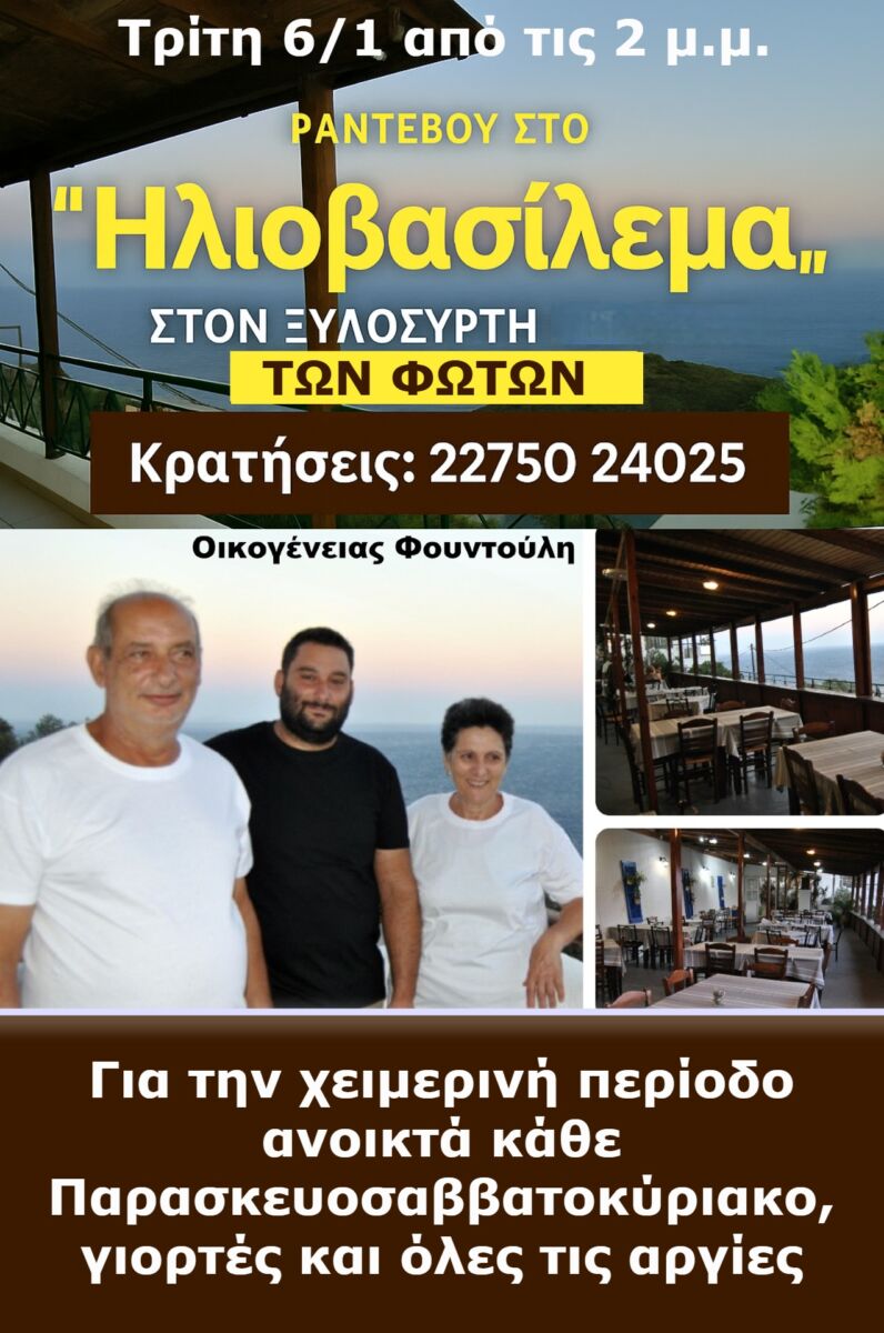 Των Φώτων, Ραντεβού στο Ηλιοβασίλεμα! Από τις 2 το μεσημέρι, με διαλεκτά πιάτα της ώρας, εκλεκτους μεζέδες, ικαριώτικο – καλό κρασί και την ζεστή φιλοξενία της οικογένειας Φουντούλη!