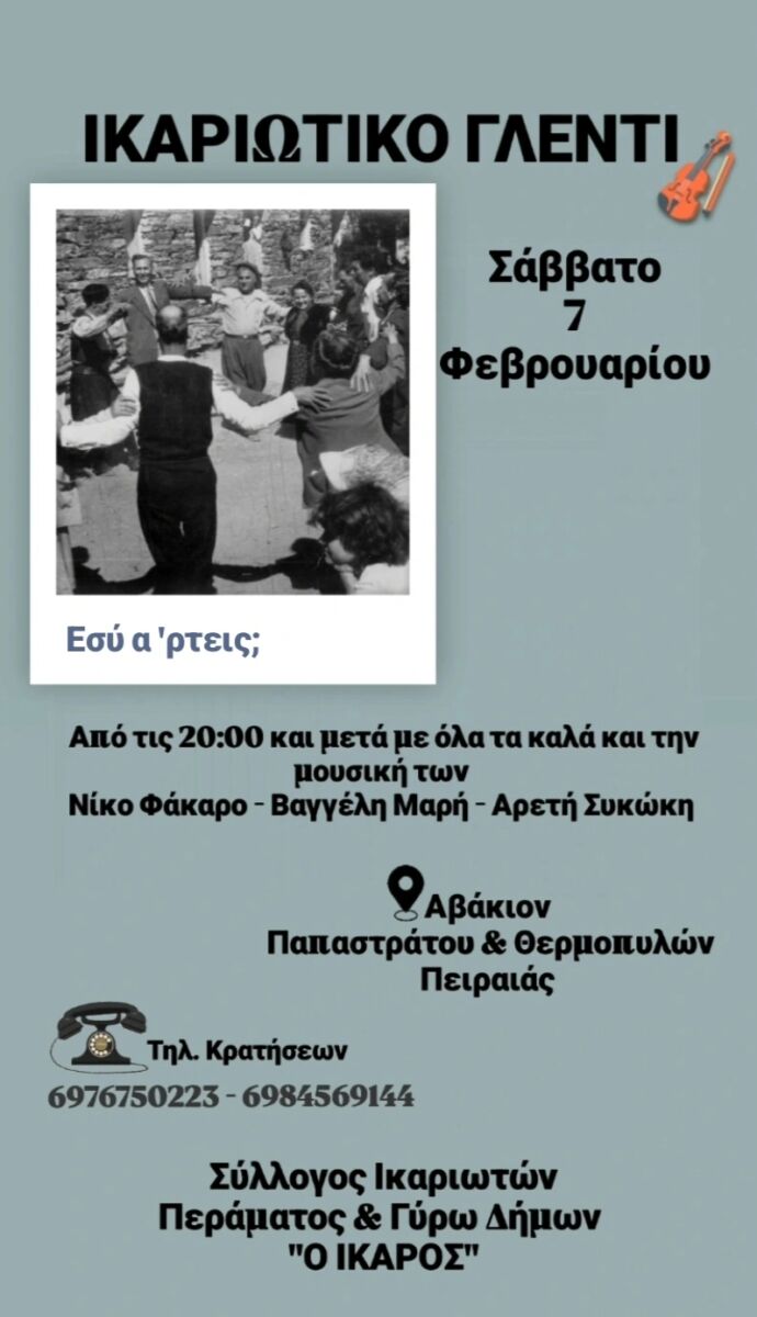 Ο Σύλλογος Ικαριωτών Περάματος και Γύρω Δήμων «Ο Ίκαρος» μας καλεί στον μεγάλο ετήσιο χορό του, το Σάββατο 7 Φεβρουαρίου και το ραντεβού δίνεται από τις 20:00 και μετά.