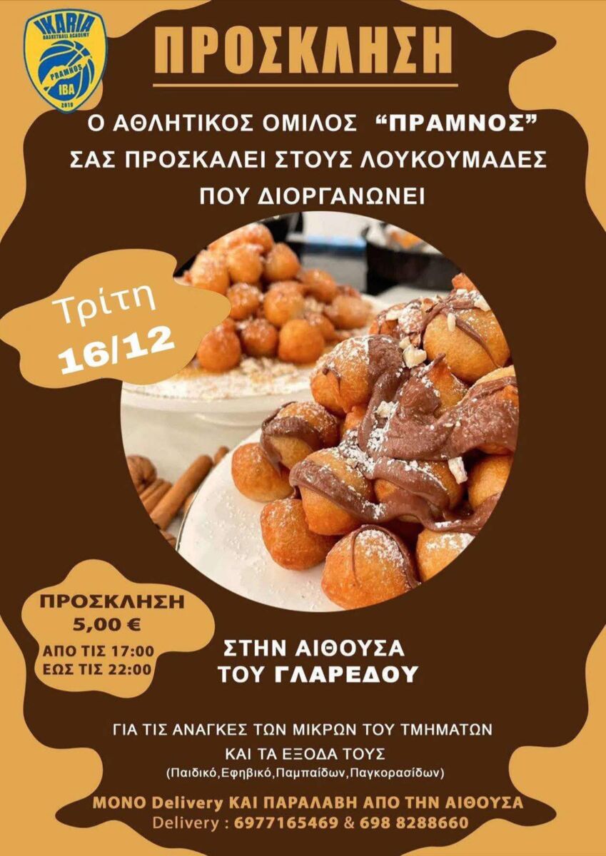 Εκδήλωση οικονομικής ενίσχυσης πραγματοποιεί σήμερα, Τρίτη 16 Δεκεμβρίου, ο Αθλητικός Όμιλος Πράμνος με λαχταριστούς λουκουμάδες στην αίθουσα εκδηλώσεων των Γλαρέδων, από τις 5.00 το απόγευμα έως τις 10.00 το βράδυ, με δυνατότητα επι τόπου παραλαβής ή διανομής στον χώρο σας.