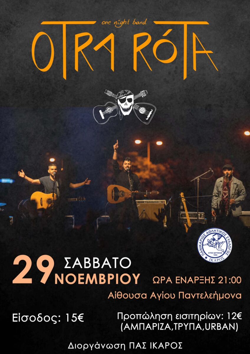 Το Σάββατο 29 Νοεμβρίου, στις 21:00, στην Αίθουσα Αγίου Παντελεήμονα, το νησί θα φιλοξενήσει μουσική, χορό και τη μουσική φιλοσοφία των Otra Róta. Ένα πολυμελές σχήμα έξι μουσικών, μια βραδιά γιορτής που υπόσχεται να γίνει ένα μεγάλο γλέντι.