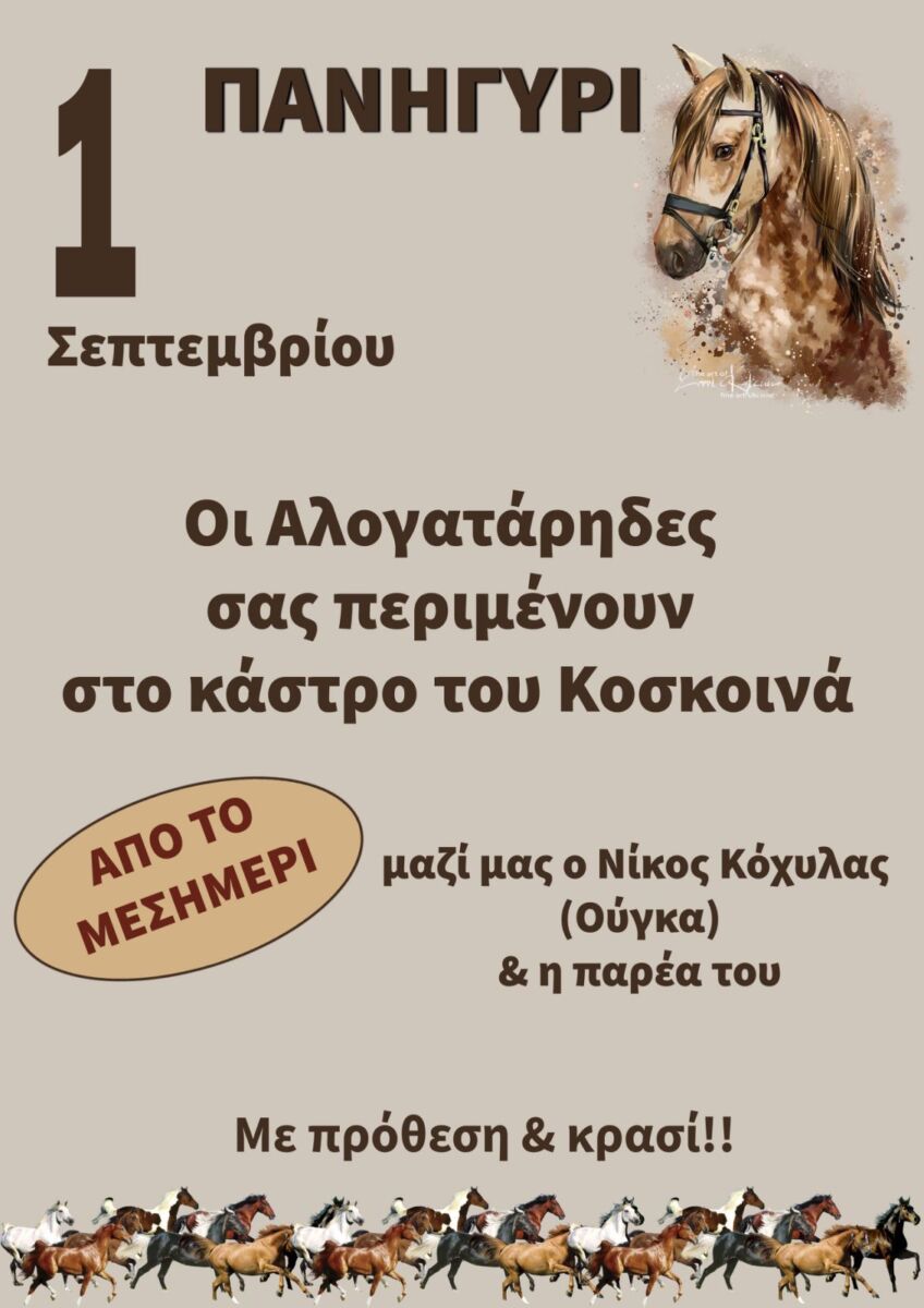 Τη Δευτέρα 1η Σεπτεμβρίου, στα Κοσσοίκια κάτω από το Κάστρο του Κοσκινά, θα γίνει το Πανηγύρι των Αλογατάρηδων. Την εκδήλωση οργανώνει ο Πανικαριακός Ιππικός Όμιλος “Άγιος Γεώργιος Δοργανάς”, με μουσική από το μεσημέρι από την ορχήστρα του Νίκου Κόχυλα. Μια γιορτή με άλογα, μουσική και ικαριώτικη παράδοση περιμένει κατοίκους και επισκέπτες.