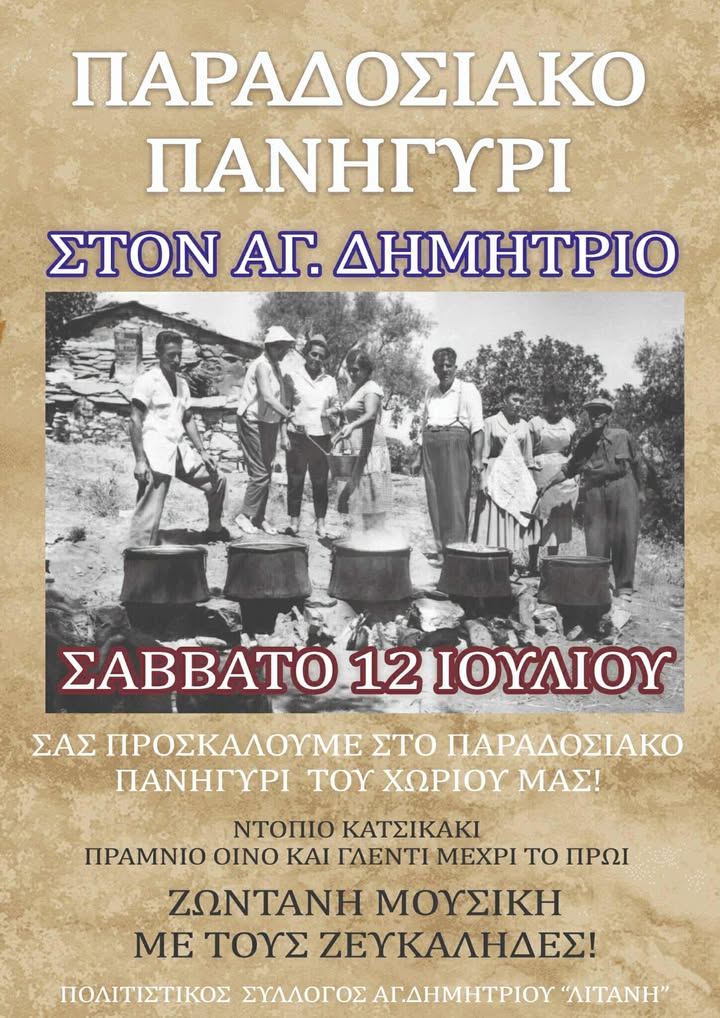 Ο Πολιτιστικός Σύλλογος Αγίου Δημητρίου «Λιτάνη» διοργανώνει μεγάλο πανηγύρι το Σάββατο 12 Ιουλίου στην πλατεία του χωριού.