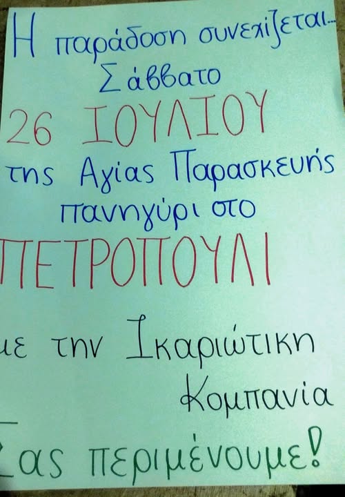Το Σάββατο 26 Ιουλίου το Πετροπούλι προετοιμάζεται η υποδεχθεί ντόπιους και επισκέπτες στο καθιερωμένο πανηγύρι της Αγίας Παρασκευής που διοργανώνει ο Εξωραϊστικός Εκπολιτιστικός Σύλλογος Πετροπουλίου Ικαρίας «Το Βουνάρι». Η καρδιά της τοπικής παράδοσης θα χτυπήσει δυνατά, υπό τους ήχους της Ικαριώτικης Κομπανίας, που εγγυάται ασταμάτητο χορό, τραγούδι και αξέχαστη διασκέδαση μέχρι τα ξημερώματα.