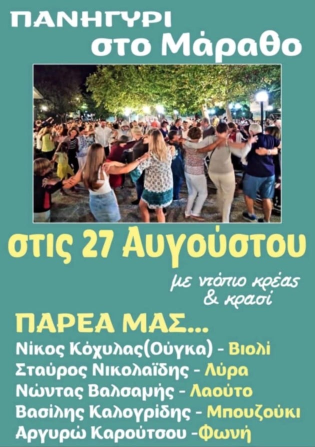 Ο Πολιτιστικός Σύλλογος Μάραθου Ικαρίας προσκαλεί και φέτος κατοίκους και επισκέπτες στο καθιερωμένο πανηγύρι του Αγίου Φανουρίου, την Τετάρτη 27 Αυγούστου, στον φιλόξενο χώρο του χωριού. Ένα από τα πιο ζωντανά πανηγύρια του νησιού, γεμάτο παράδοση, μουσική και γνήσιο ικαριώτικο κέφι, που αναμένεται να κρατήσει μέχρι τις πρώτες πρωινές ώρες.