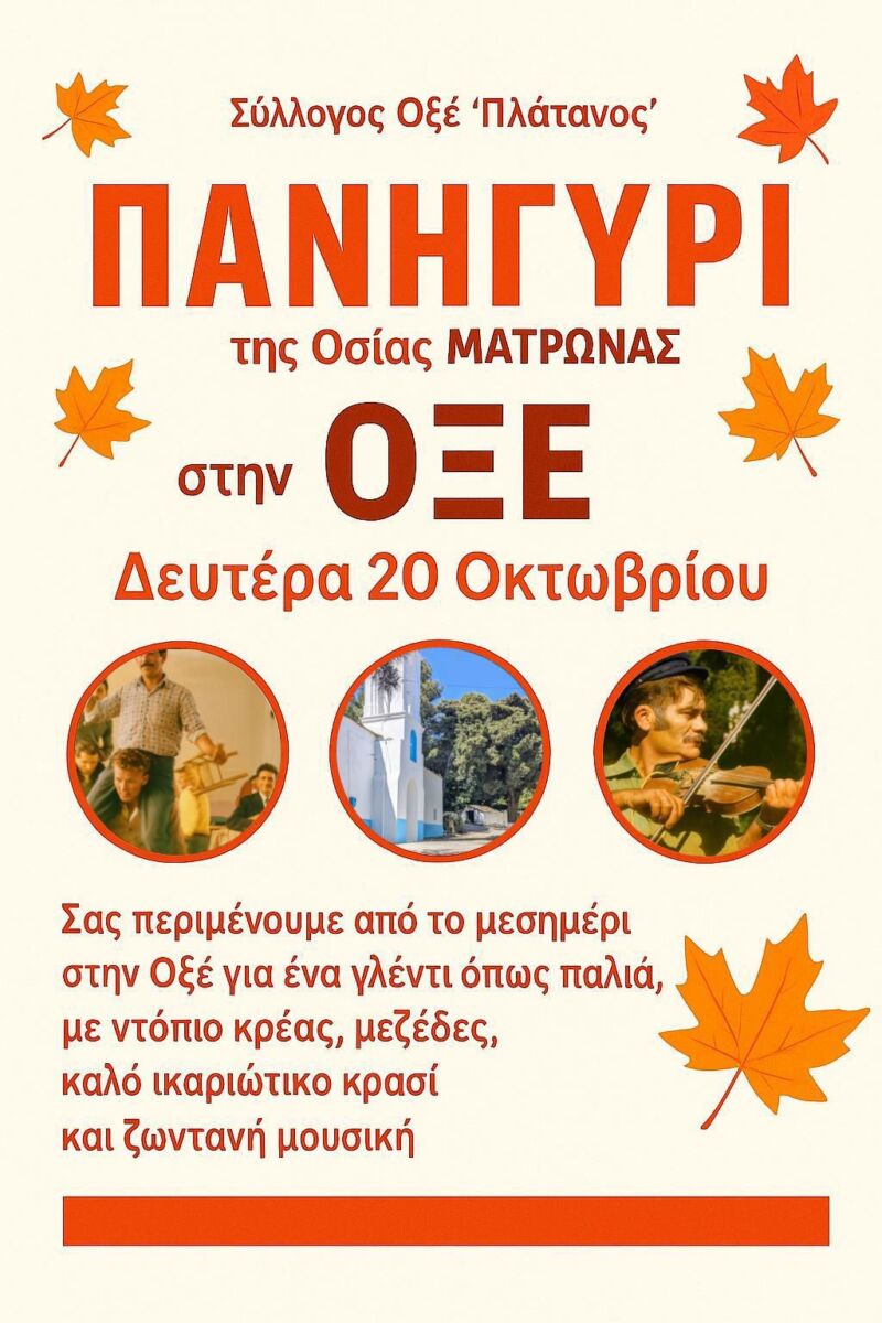 Η Οξέ γιορτάζει όπως παλιά την εορτή της Οσίας Ματρώνας και ο Σύλλογος «Πλάτανος» διοργανώνει παραδοσιακό πανηγύρι τη Δευτέρα 20 Οκτωβρίου στην αίθουσα του χωριού.