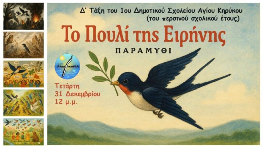 Την Τετάρτη 31 Δεκεμβρίου, στις 12 το μεσημέρι, η Δ’ Τάξη του 1ου Δημοτικού Σχολείου Αγίου Κηρύκου (του περισνού σχολικού έτους) παρουσιάζει σε πρώτη ραδιοφωνική μετάδοση τη διασκευή του παραμυθιού «Το Πουλί της Ειρήνης», έργο που δημιούργησαν τα ίδια τα παιδιά με την καθοδήγηση της δασκάλας τους, Μαριάνθης Ρούσσου.