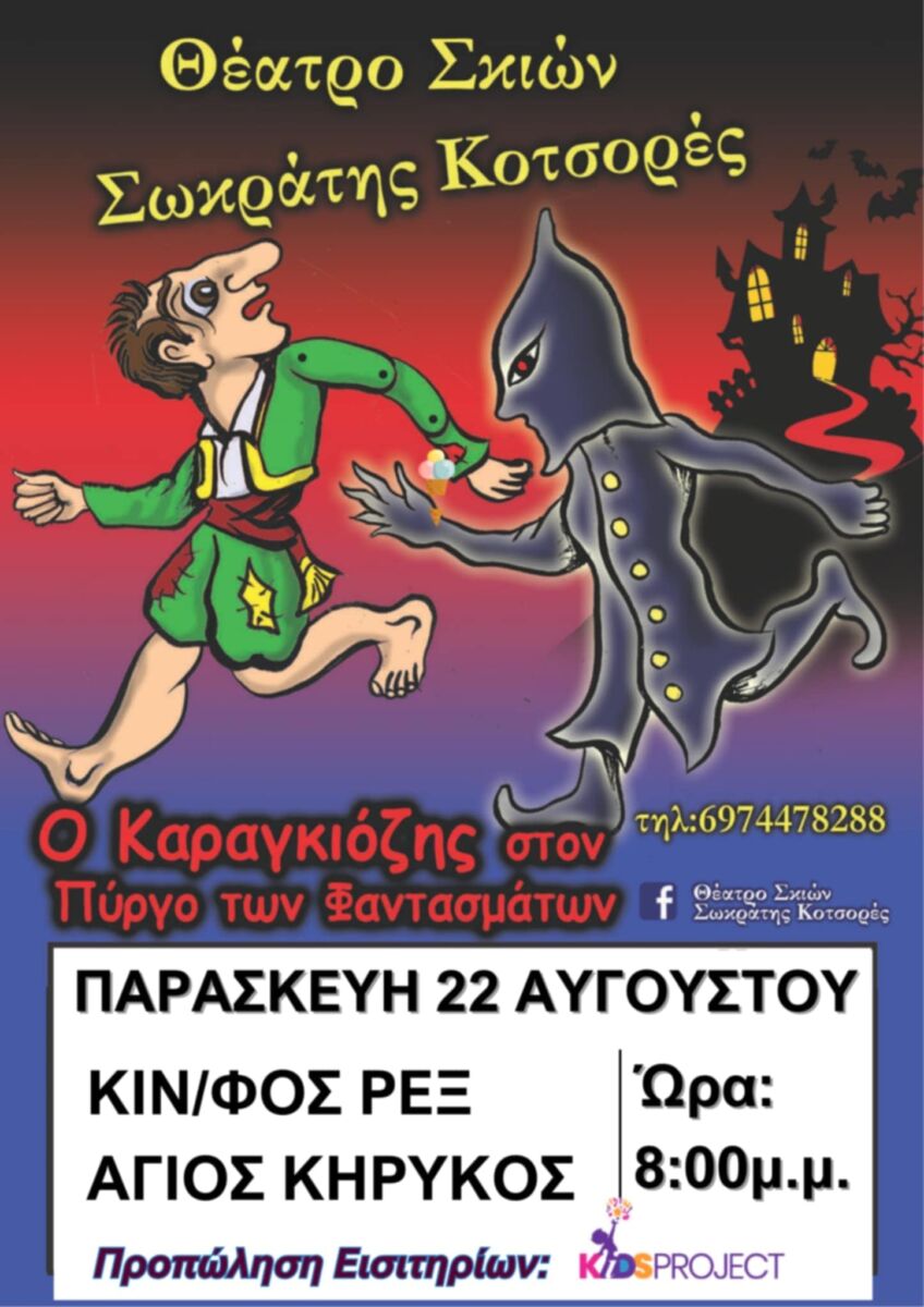 Ο παραδοσιακός Καραγκιόζης επιστρέφει δυναμικά στον Άγιο Κήρυκο, για να χαρίσει γέλιο, συγκίνηση και μαγεία σε μικρούς και μεγάλους. Σήμερα Παρασκευή 22 Αυγούστου, στις 20:00, ο αγαπημένος καραγκιοζοπαίχτης Σωκράτης Κοτσορές παρουσιάζει στον θερινό Δημοτικό Κινηματογράφο «Rex» την παράσταση «Ο Καραγκιόζης στον Πύργο των Φαντασμάτων», μια μοναδική ιστορία γεμάτη σασπένς, ανατροπές και βεβαίως το αστείρευτο χιούμορ του λαϊκού μας ήρωα.