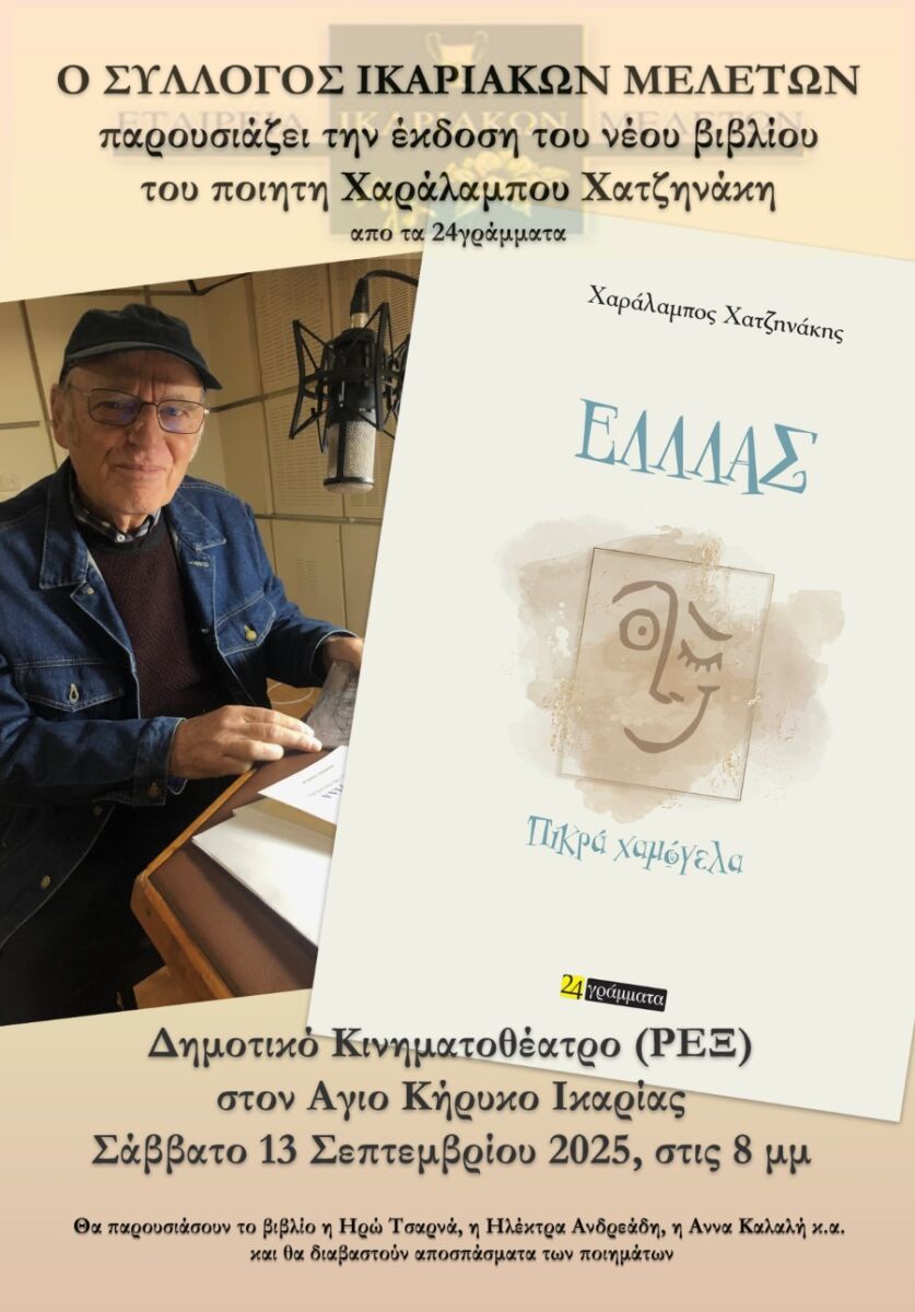 Το Σάββατο 13/9/2025, 8μμ,  στον Άγιο Κήρυκο (Δημοτικό Κινηματοθέατρο) στις 8μμ ο Σύλλογος Ικαριακών Μελετών παρουσιάζει  το νέο βιβλίο ποιημάτων “ΕΛΛΛΑΣ” του μέλους του ποιητή Χαράλαμπου Χατζηνάκη (24γράμματα). Την παρουσίαση επιμελούνται η Ηρώ Τσαρνά, Ηλέκτρα Ανδρεάδη και Αννα Καλαλή.
