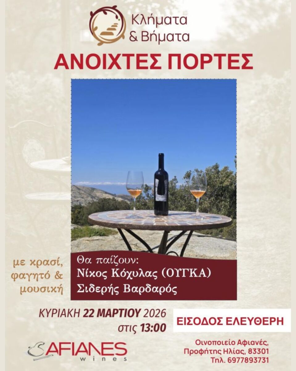 Με μια γιορτή ανοιχτή για το κοινό ξεκινούν οι ανοιξιάτικες δράσεις «Κλήματα & Βήματα» στο Οινοποιείο Αφιανέ, στον Προφήτη Ηλία Ραχών. Η εκδήλωση συνδυάζει την οινογνωσία με την τοπική γαστρονομία και τη ζωντανή μουσική, καθώς περιλαμβάνει μουσική από τους Νίκο Κόχυλα και Σιδερή Βαρδαρό.