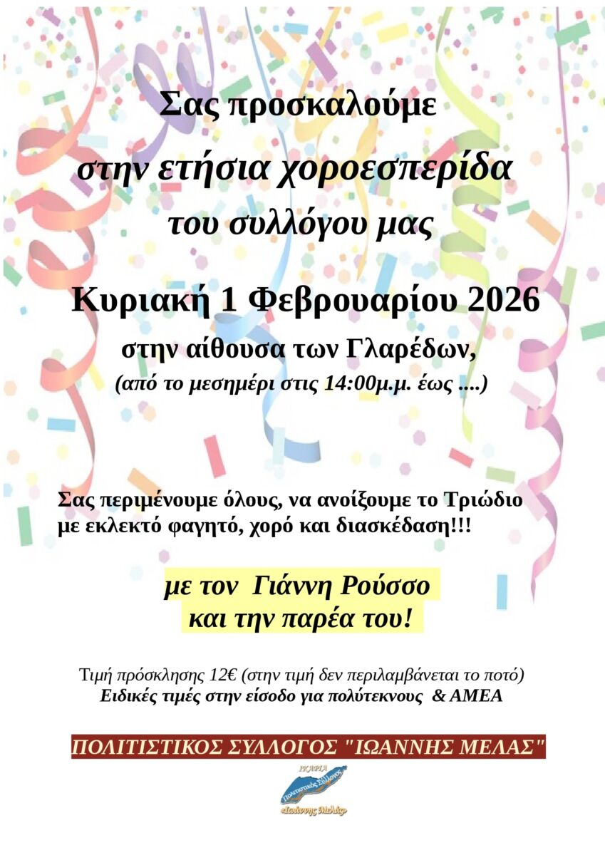 Ο Πολιτιστικός Σύλλογος «Ιωάννης Μελάς» διοργανώνει την ετήσια χοροεσπερίδα του την Κυριακή 1 Φεβρουαρίου 2026 στην αίθουσα των Γλαρέδων, με έναρξη στις 14:00.
