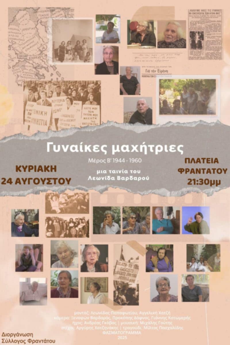 Ο Κοινωνικός και Εκπολιτιστικός Σύλλογος Φραντάτου «Φραντάτο», σας προσκαλεί την Κυριακή 24 Αυγούστου, στις 21:30, στην πλατεία του χωριού όπου θα προβληθεί το νέο ντοκιμαντέρ του συμπατριώτη μας σκηνοθέτη Λεωνίδα Βαρδαρού «Γυναίκες μαχήτριες – Μέρος Β’ 1944-1960».